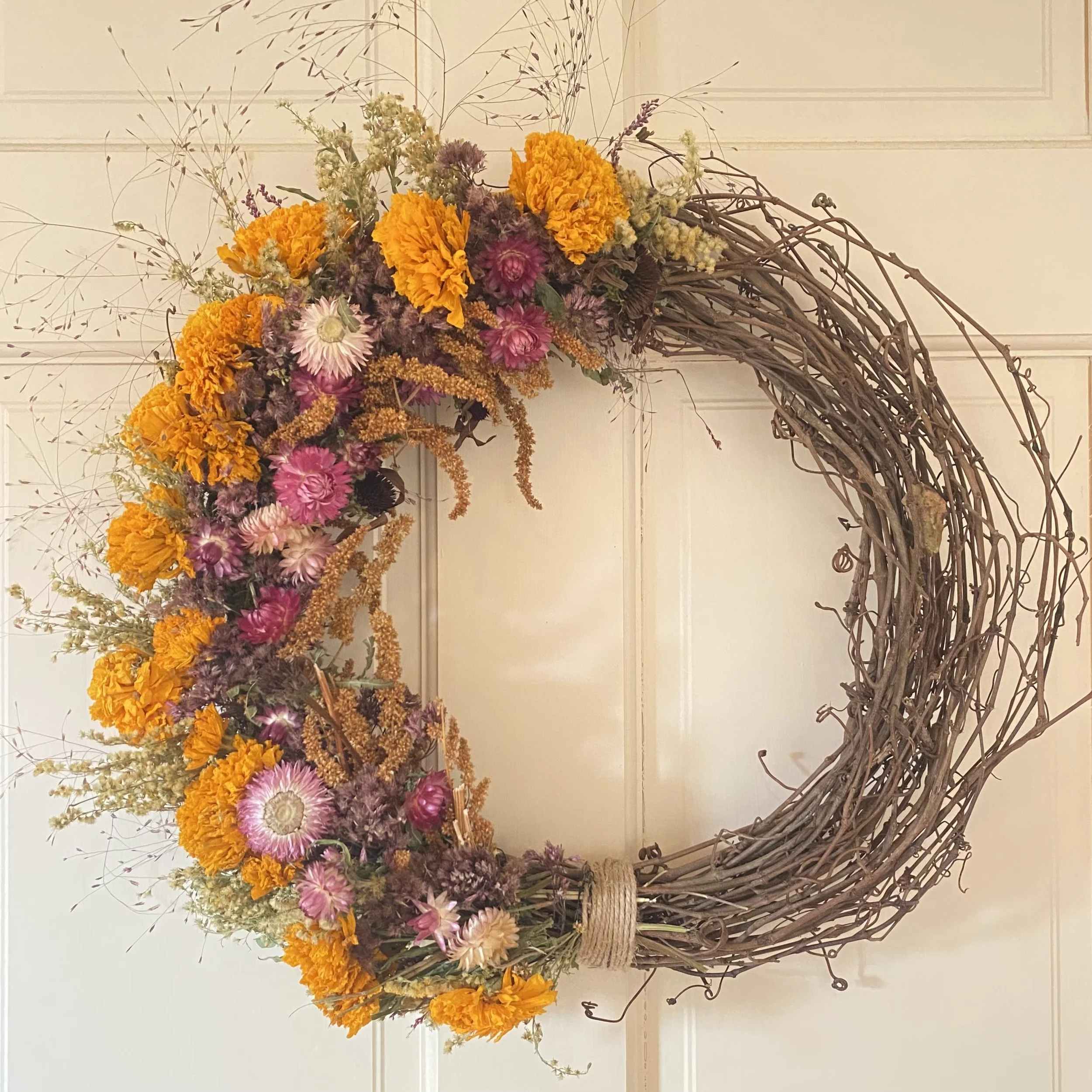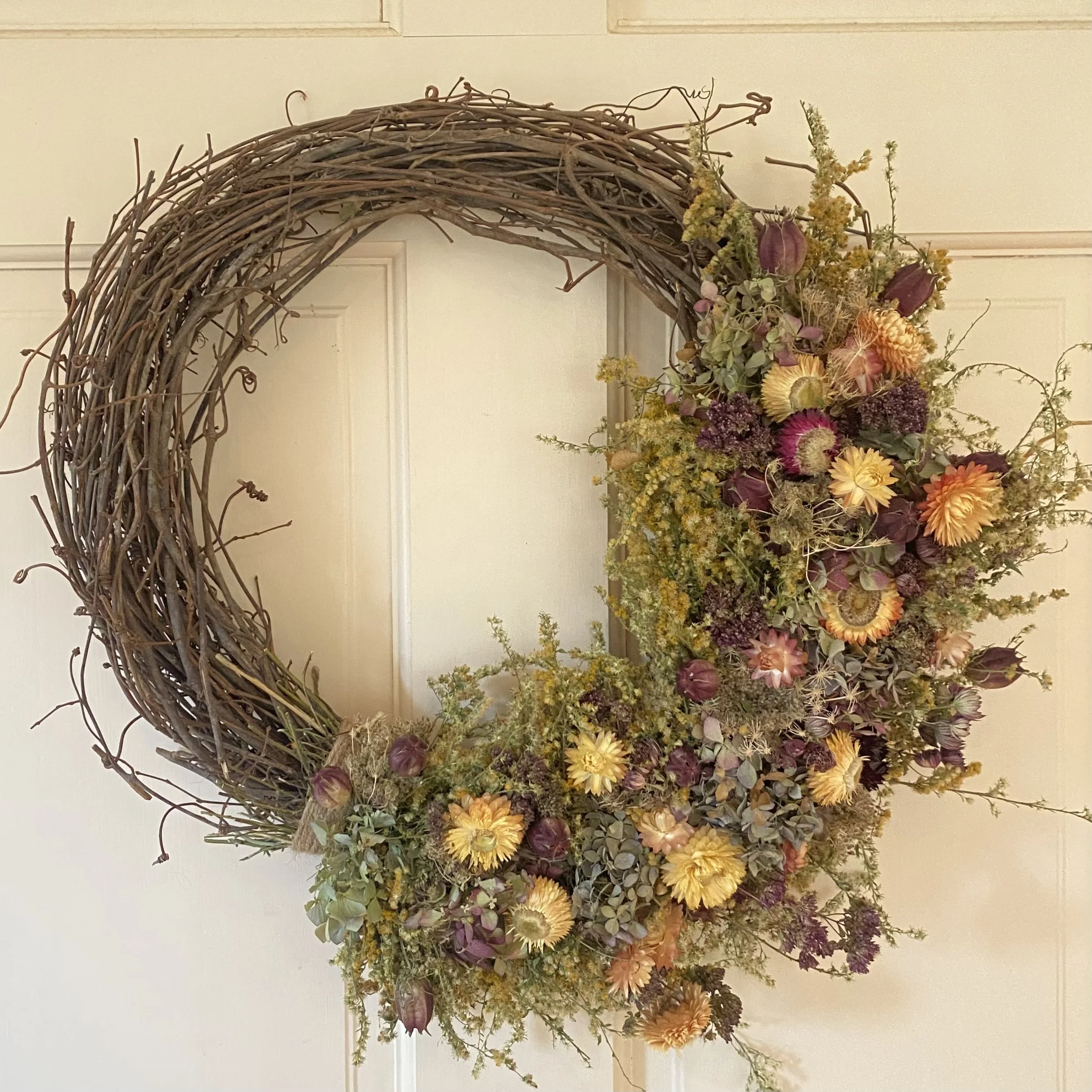 Golden hues, mauve celosia & amaranth tendrils, this collection brings the warmth of the late summer sun into the darker months of winter. Adorn your home with an everlasting wreath and feel the bounty of the harvest season all year.